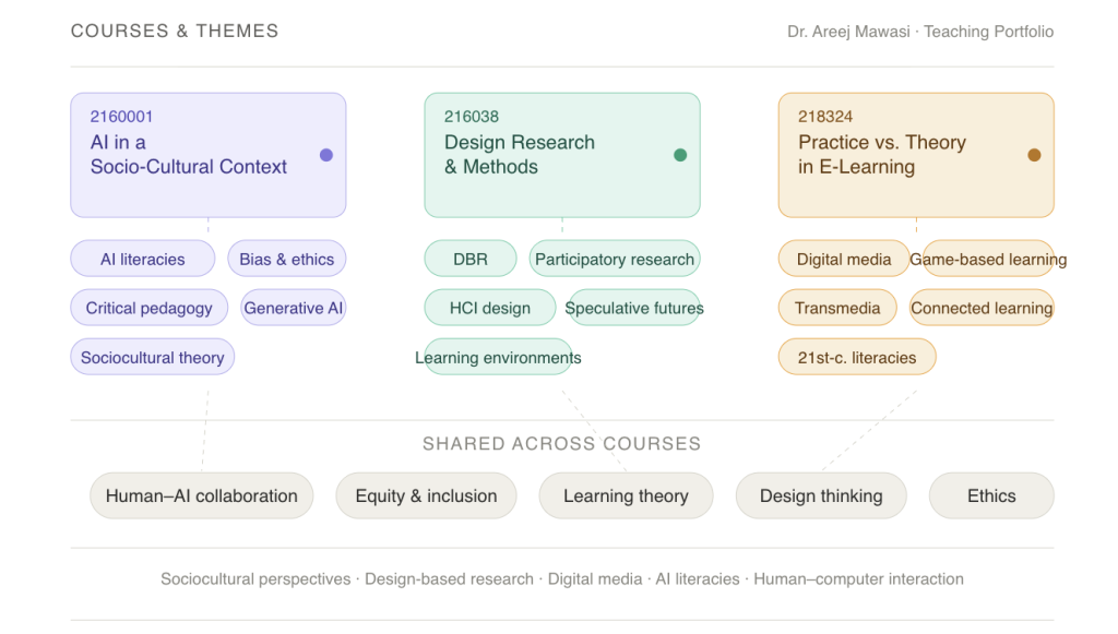 Dr. Areej Mawasi teaches courses that integrate sociocultural perspectives on learning, design-based research methodologies, digital media, AI literacies, and human-computer interaction.